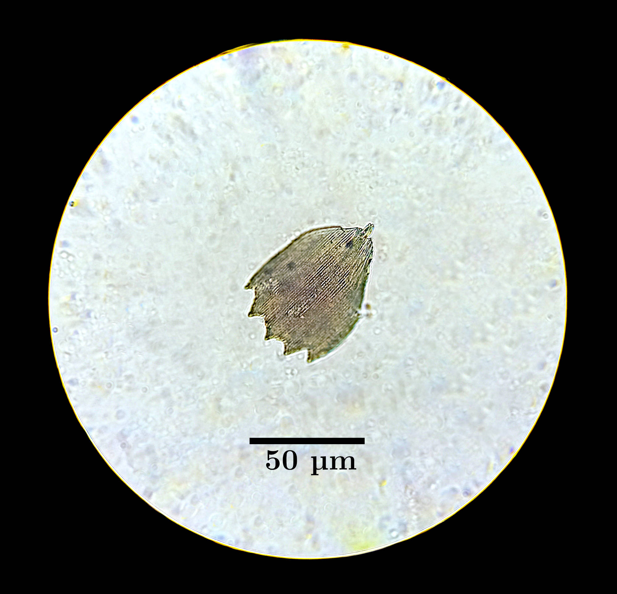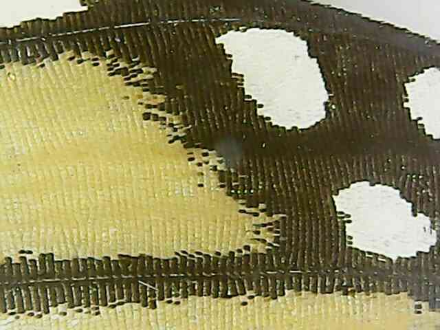 Scale from the top surface of a butterfly wing (12.5× eyepiece, 40× objective, no staining on a Leitz SM). The ridges interract with light to create vibrant colors.