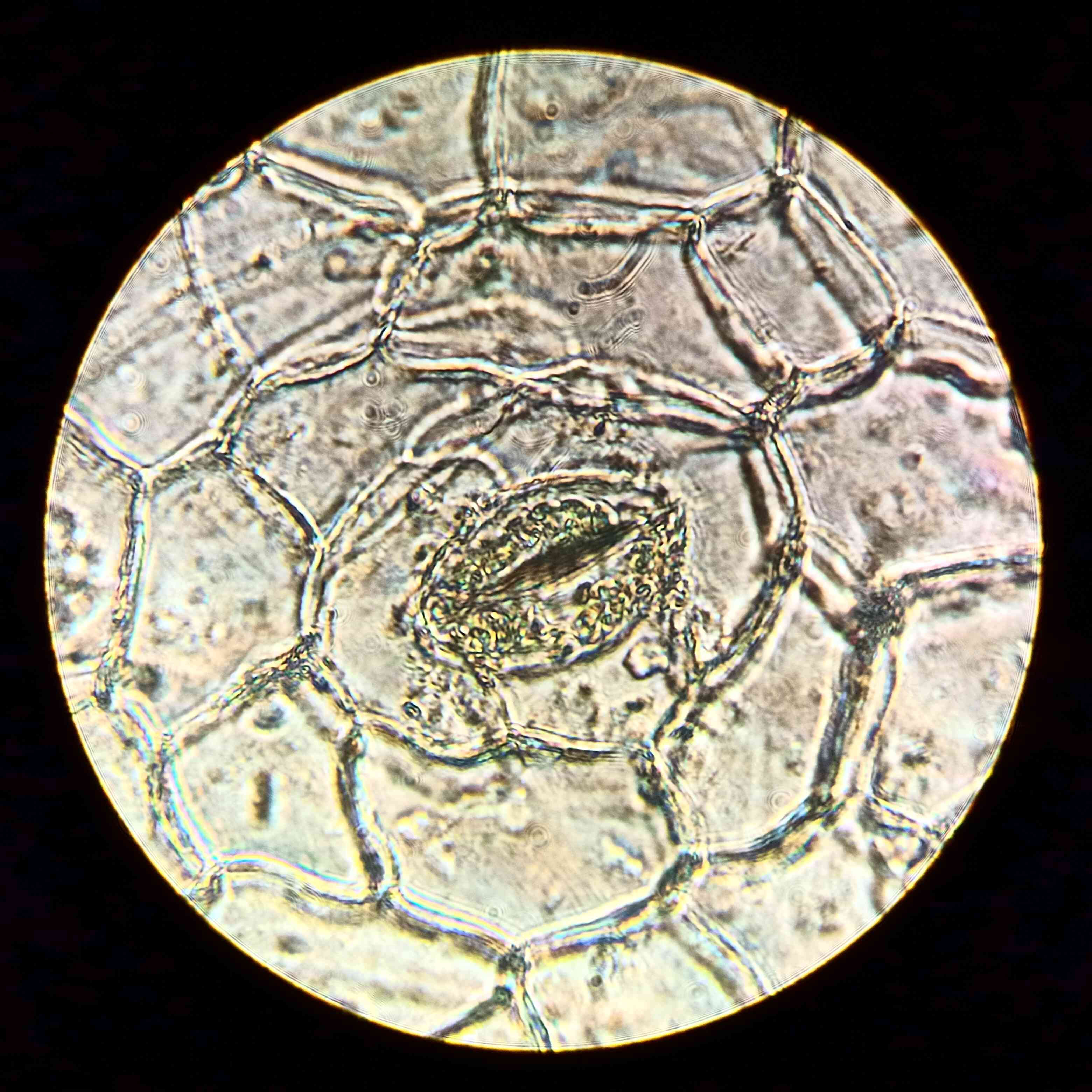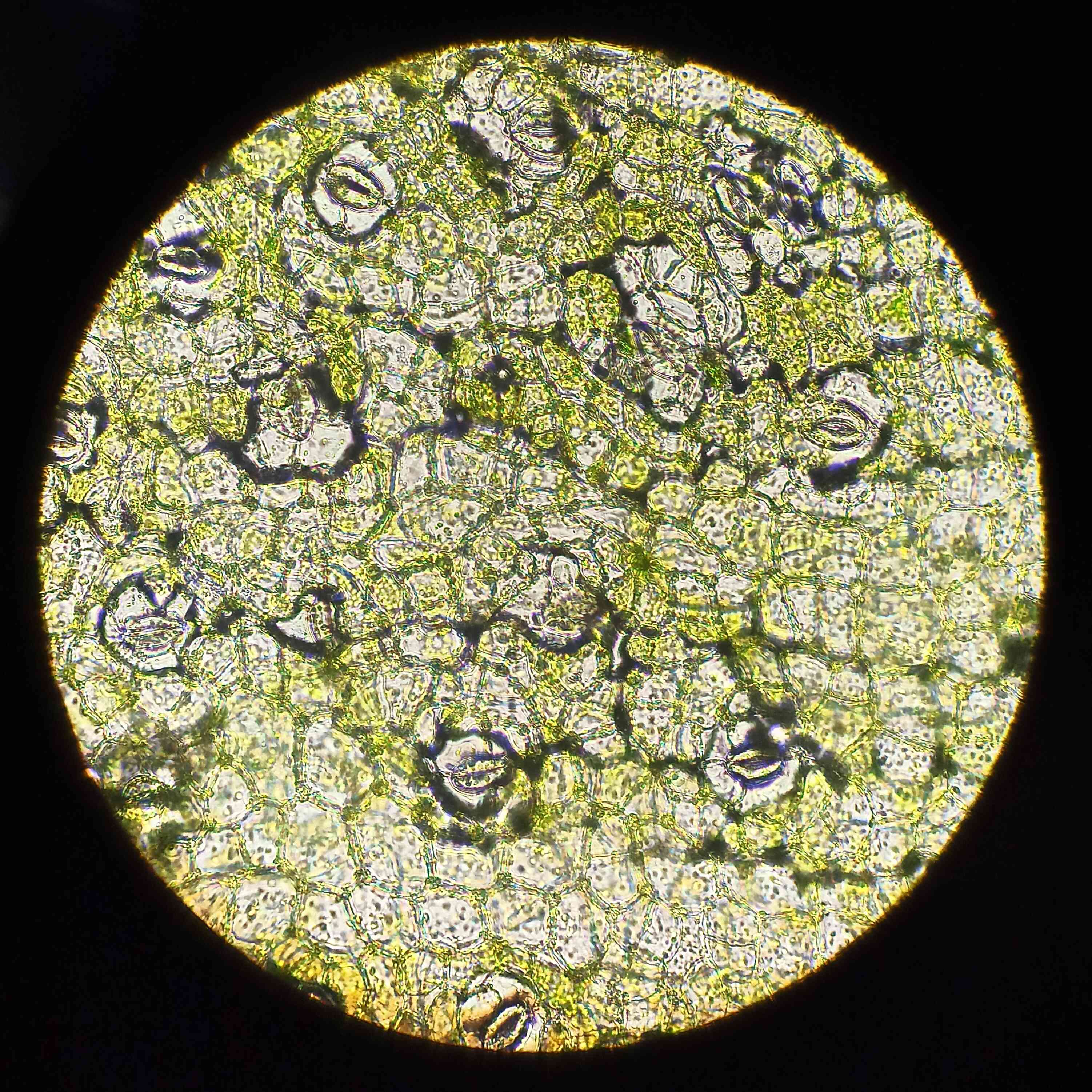 Stomata of a Succulent Crassula Ovata (Jade plant) leaf (12.5× eyepiece, 100× objective, no staining on a Leitz SM). Chloroplasts are seen in the gard cells.