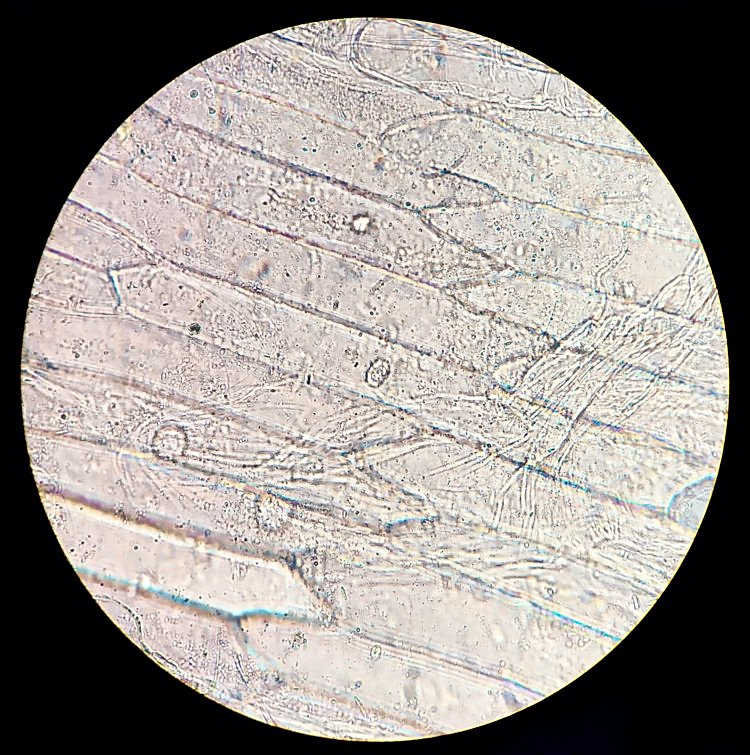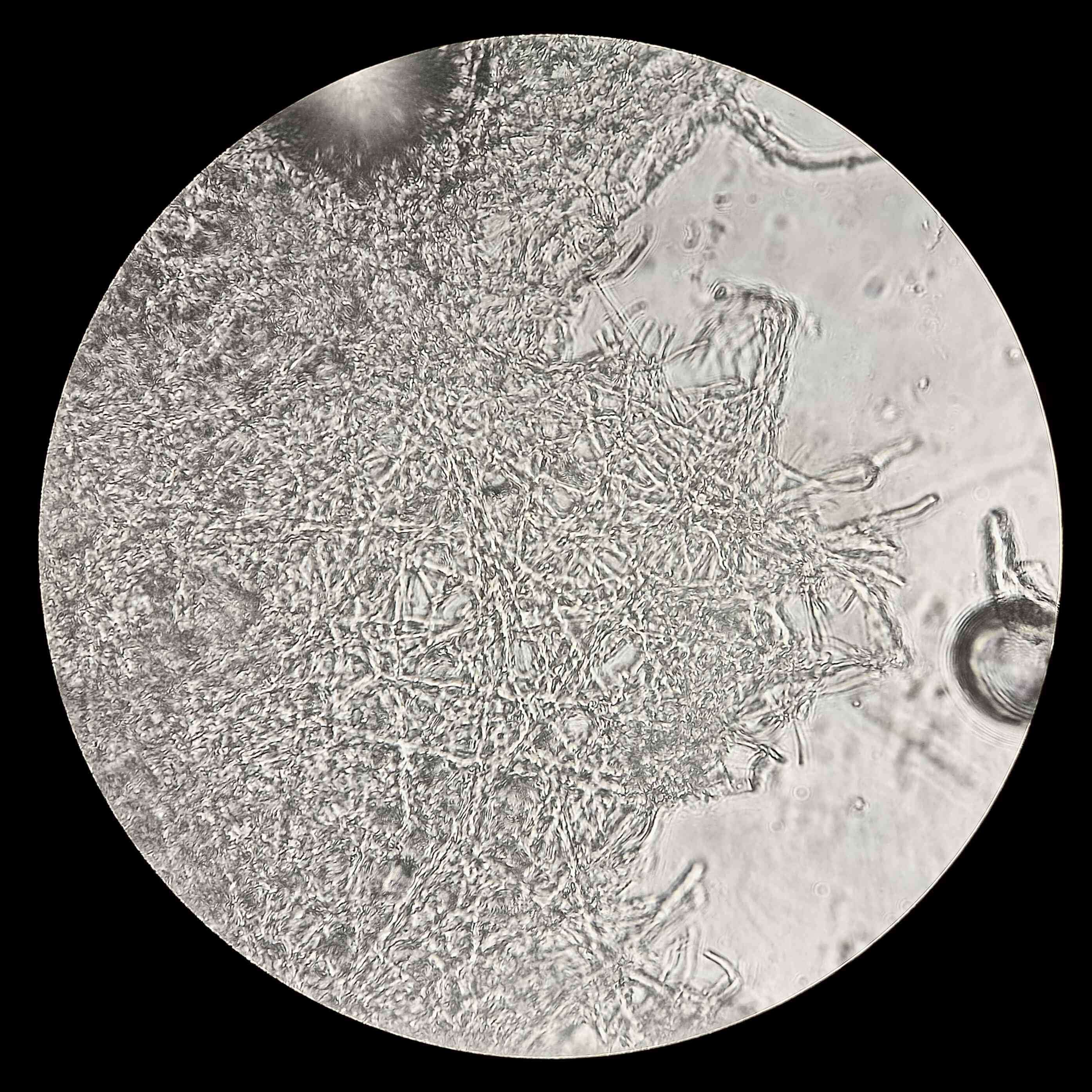 The thin skin between an egg shell and its white (12.5× eyepiece, 40× objective, no staining on a Leitz SM).