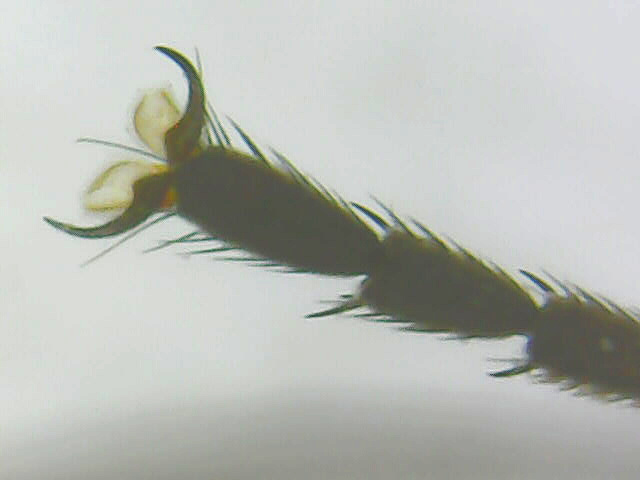 Foot end of a musca domestica. The beige colored appendices are sticky while the claws can help the fly pry its footpads loose.