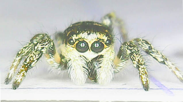 Front view of a jumping spider. The pair of big eyes (anterior median eyes) is built like a telescopic tube and gives very good vision while the 3 secondary pairs gives it a 360° field of view.