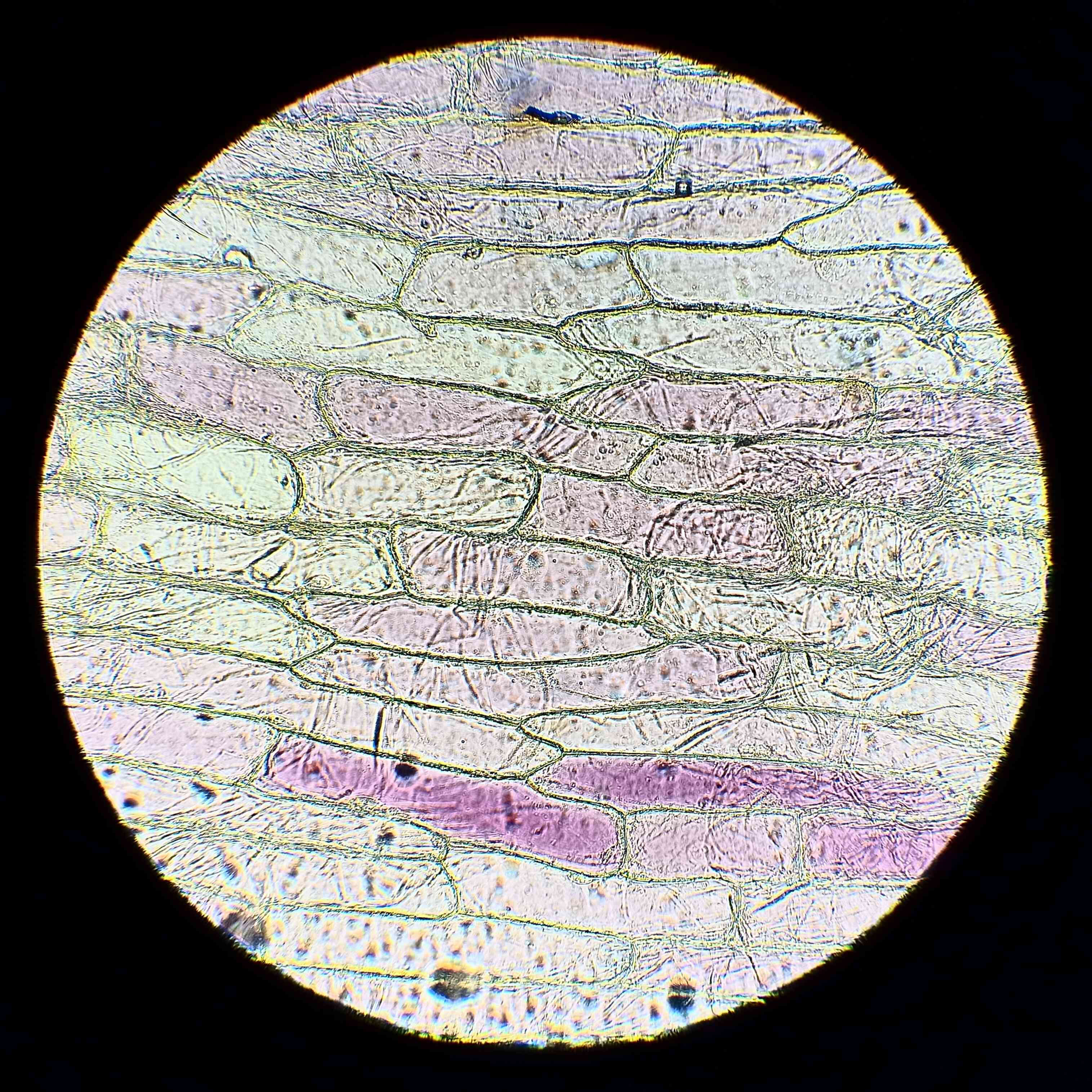 Epidermal cells from an red onion (12.5× eyepiece, 25× objective, no staining on a Leitz SM).