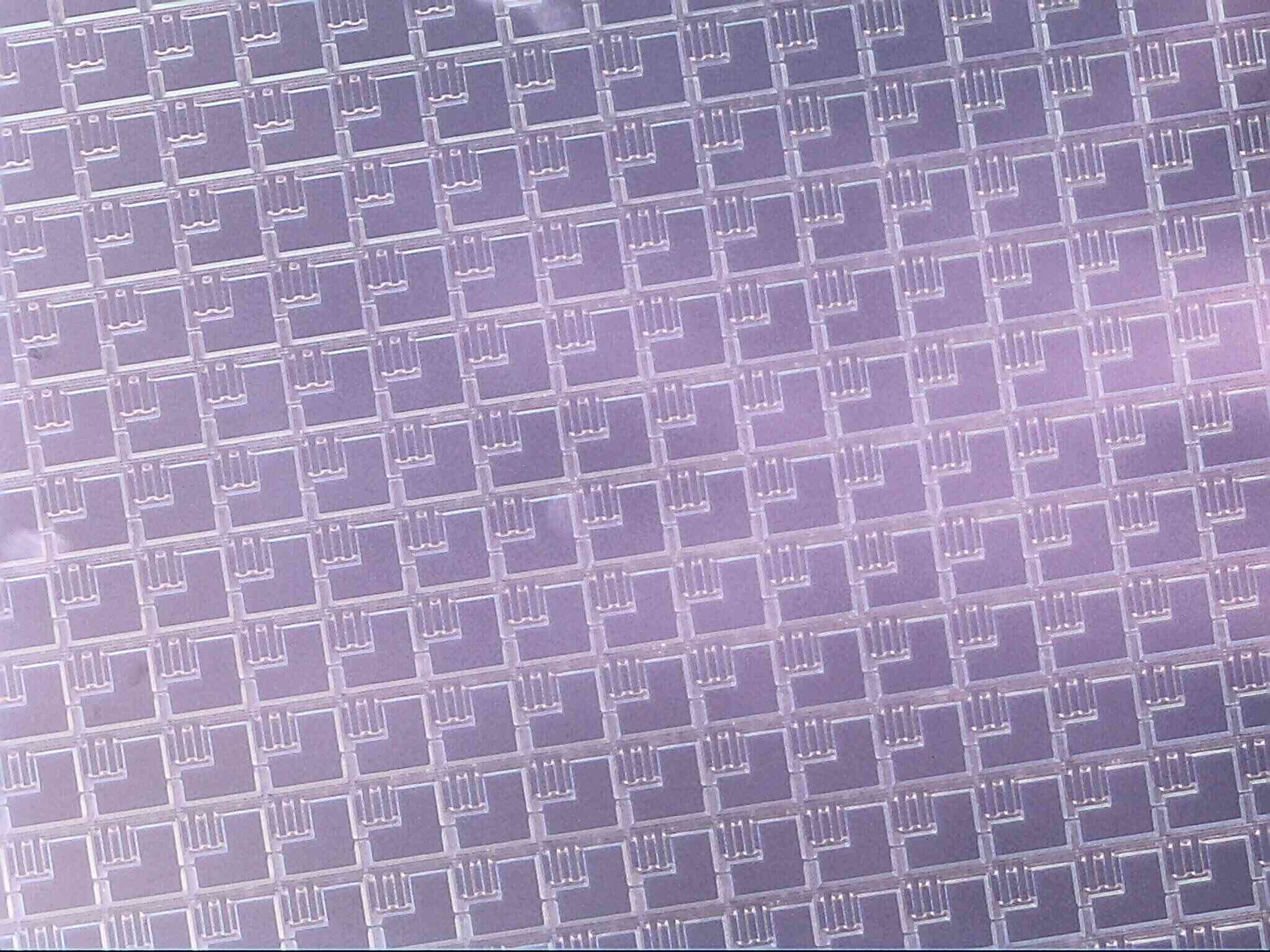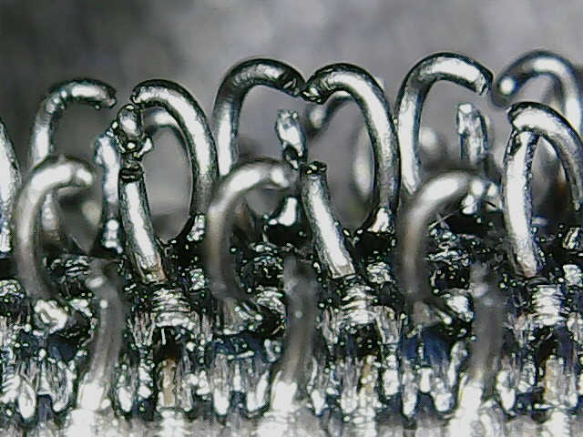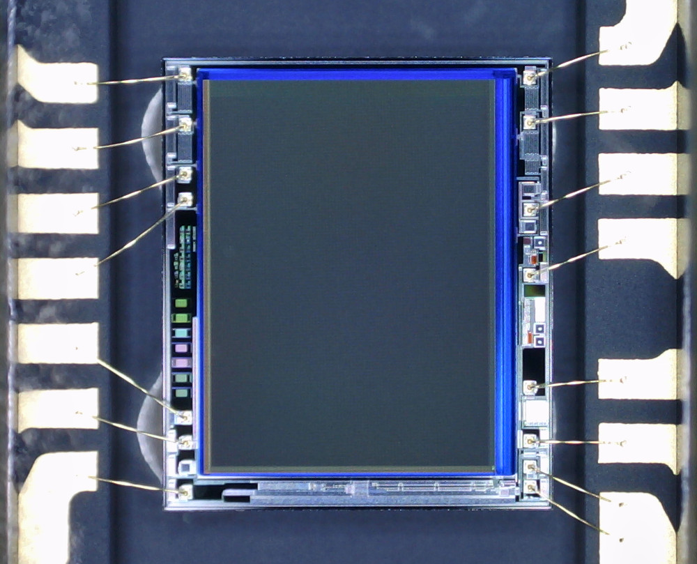Close-up view on the back of an e-ink display (price tag). The plates are electrodes that move the charged pigment.
